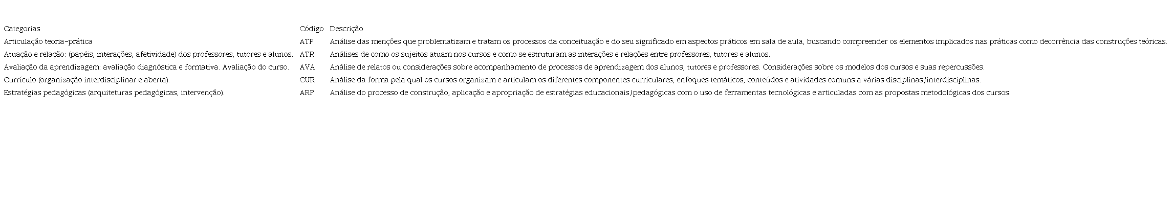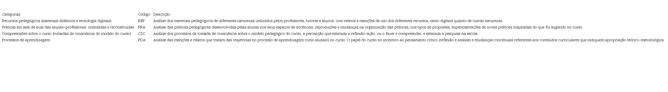 A análise dos dados foi realizada considerando nove categorias que permitem, potencialmente, no seu conjunto, responder à questão da pesquisa. As categorias foram definidas, conforme apresentadas no Quadro 1.