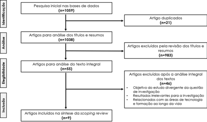 Os 1038 estudos foram obtidos através da análise das palavras contidas nos títulos, resumos e descritores, bem como da leitura transversal dos 1059 artigos, sendo excluídos aqueles que: (a) eram repetidos em diferentes fornecedores de conteúdos, (b) o objetivo do estudo não correspondia ao pretendido, e (c) não apresentavam resultados relevantes para a pesquisa. Após a leitura dos títulos e resumos, foram selecionados 55 artigos para leitura integral. Deste processo de análise exaustivo, resultou a amostra final de nove estudos a incluir na presente revisão. O processo de pesquisa e seleção destes está apresentado no seguinte fluxograma.