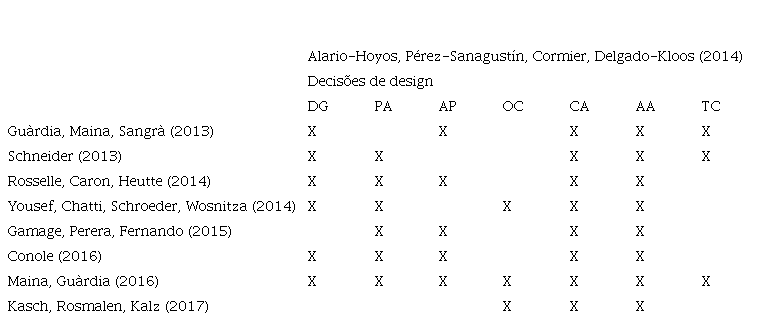Não obstante, alguns investigadores defendem que esta classificação é insuficiente para descrever a variedade de MOOC, bem como a forma como estes são delineados e projetados (ALARIO-HOYOS; PÉREZ-SANAGUSTÍN; CORMIER; DELGADO-KLOOS, 2014; CONOLE, 2016; POZZI; CONOLE, 2014). Como resultado, têm sido desenvolvidos inúmeros trabalhos que procuram dar resposta a esta preocupação e clarificar princípios e orientações para o design, existindo assim a necessidade de desenvolver novas taxonomias que viabilizem a interseção de diferentes tipos e estruturas de MOOC.
