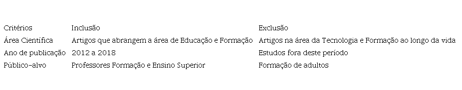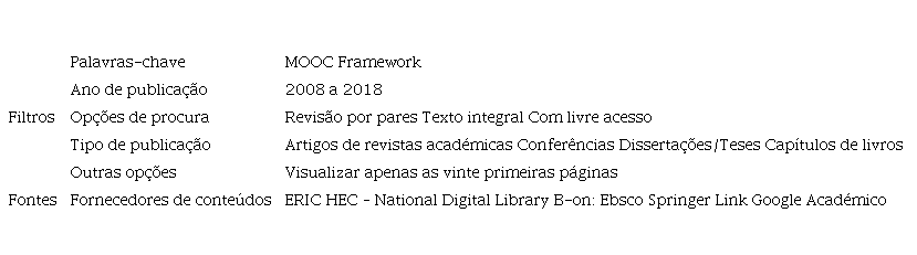 Considerou-se importante definir um intervalo de data de publicação, delimitado entre 2008 e 2018, por um lado, pelo facto dos MOOC terem surgido em 2008 e por outro, para se perceber a tendência de trabalhos realizados cujo propósito incidisse no desenvolvimento de framework na área dos cursos massivos. Adicionalmente, determinou-se que os artigos só seriam recolhidos se respeitassem os seguintes critérios: (a) estivesse disponível o texto na íntegra, (b) com livre acesso, e (c) decorressem de um processo de revisão por pares.