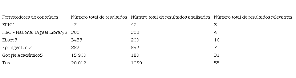 Por último, as bases de dados utilizadas nesta pesquisa foram (a) ERIC, (b) HEC – National Digital Library, (c) B-on: Ebsco, (d) Springer Link e (e) Google Académico.