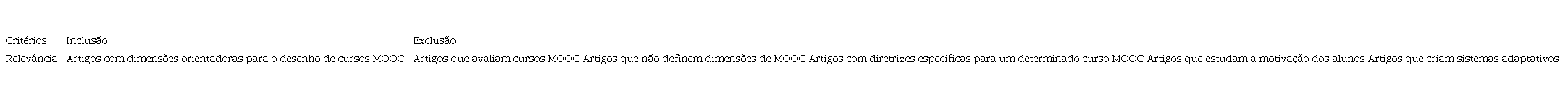 Para a pesquisa foram estabelecidas as palavras-chave ‘MOOC’ e ‘Framework’, pelo facto de não limitar os dados a extrair, independentemente da área, público-alvo ou desenho do estudo.