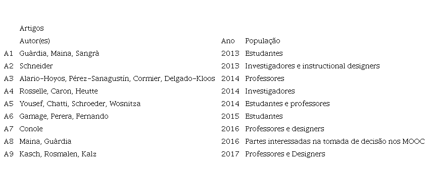 As palavras-chave que se destacam nos artigos selecionados são MOOC, MOOC design, framework, learning design, online learning, quality e pedagogies.