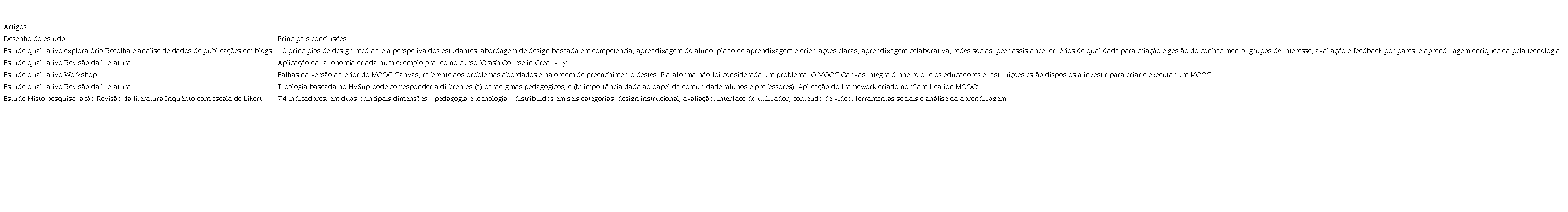 Os dados recolhidos neste estudo permitiram identificar e descrever os resultados subjacentes ao processo de scoping literature review, metodologia estruturada para identificar na literatura quais as caraterísticas essenciais para o design de MOOC na formação de professores.