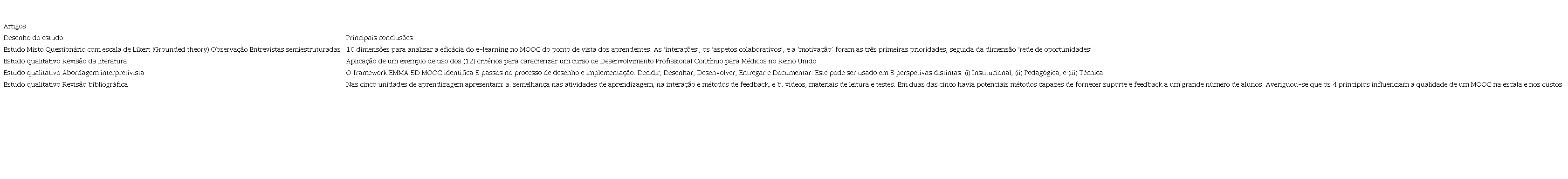 Constata-se a prevalência de trabalhos desenvolvidos no ano 2014. No que se refere aos objetivos dos estudos incluídos na scoping review, evidenciaram-se pesquisas destinadas ao desenvolvimento de frameworks para MOOC, para apoiar no processo de criação e implementação deste tipo de cursos.