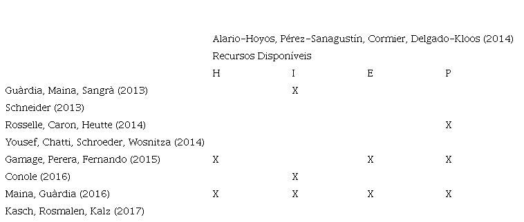 Outros conceitos similares identificados e destacadas entre as fontes (três em oito artigos) estão ligados aos objetivos e competências (OC) que os formandos devem adquirir e as tecnologias complementares (TC), bem como a plataforma (P) e os recursos intelectuais (I). Por fim, as dimensões menos abordadas referem-se aos recursos humanos (H) e os equipamentos (E).