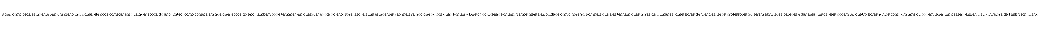 Identificamos aproximações e deslocamentos entre as escolas ditas inovadoras e aquelas ditas tradicionais – ou que mantém práticas típicas das escolas da Modernidade. Nos excertos abaixo, vemos dois exemplos de deslocamentos, ou do que temos chamado de profanações da forma-escola, nos cinco aspectos: tempo, espaço, atividades, matérias e sujeitos.