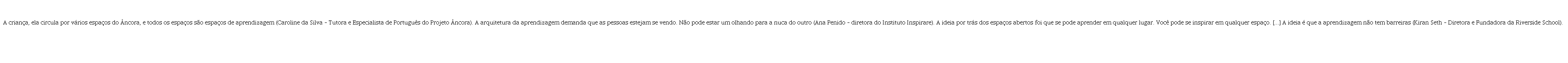 Tempo e espaço estão articulados, e isso fica claro nos depoimentos da série do Canal Futura quando enfatizam a liberdade dos alunos em utilizar todos os espaços da escola como espaços de aprendizagem. Vejamos no quadro abaixo alguns excertos que mostram as relações que se estabelecem com os espaços.