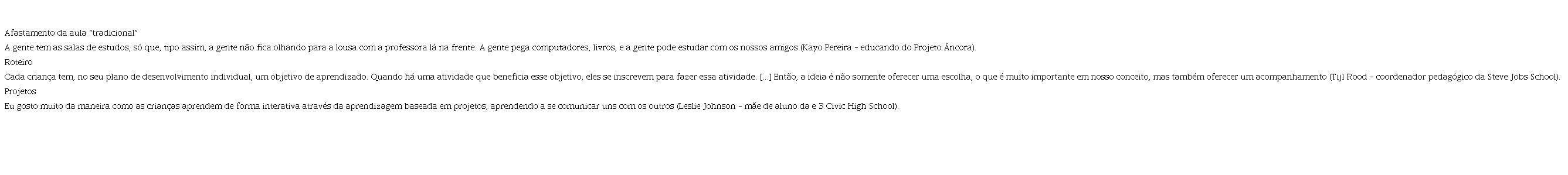 As três recorrências encontradas nas atividades das escolas são: afastamento do que se conhece culturalmente como aulas tradicionais, roteiros de planejamento e ênfase na metodologia de projetos. Os episódios da série do Canal Futura mostram o afastamento das aulas consideradas tradicionais, que escolas inovadoras buscam e enfatizam por meio das falas, principalmente de alunos, quando dizem que “não precisam ficar olhando para a lousa”, que podem buscar “maneiras diferentes da fazer as coisas”, que “não ficam todo o tempo estressados” e que “recebem orientação, ao invés de o professor dar aulas”.