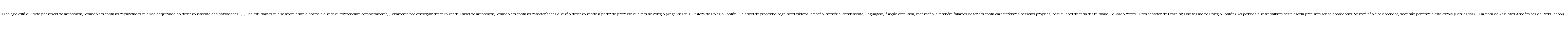 Podemos observar nas falas que a ênfase na formação desses sujeitos é muito mais voltada à dimensão subjetiva, de características socioemocionais, do que à formação e aprendizagem com foco em conteúdos disciplinares e na avaliação classificatória propriamente dita. Essa ênfase é para alunos e para professores. Nessas escolas, os alunos devem ser considerados em sua inteireza, integralmente, para que se sintam bem. O interesse está em formar alunos que sejam futuros bons cidadãos. Os professores devem desenvolver para si certas características socioemocionais, tanto quanto ou mais do que seus alunos, tais como ser um designer do tempo, do espaço e das atividades, ou ser alguém colaborativo, que trabalha com os outros.