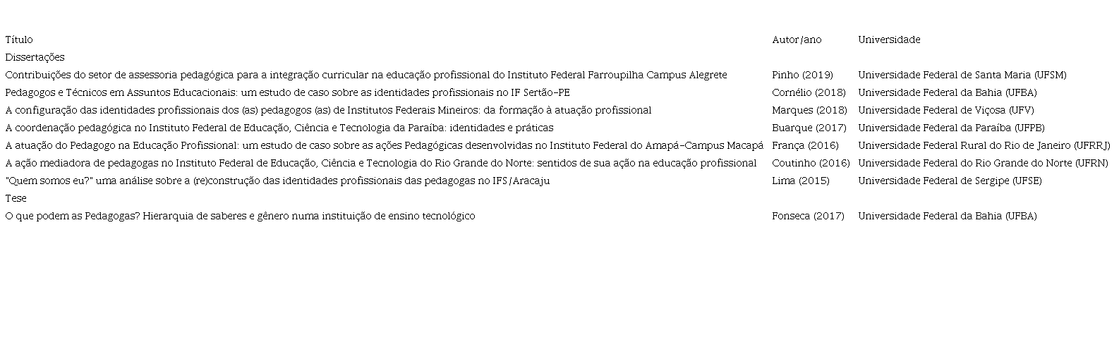 A tese e as dissertações problematizaram o papel do pedagogo nos IFs por meio da caracterização do trabalho exercido, dos sentidos atribuídos de sua ação, dos processos de reconstrução de identidades, dos limites e possibilidades de atuação do pedagogo, em paralelo ao do Técnico em Assuntos Educacionais e, ainda, das implicações de gênero em relação ao papel do pedagogo em um IF.