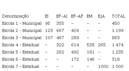 Foram escolhidas três escolas da rede municipal e quatro da rede estadual com o intuito de abranger as diferentes etapas de ensino atendidas. Cabe destacar que, em ambas as redes, o diretor escolar ascende à função por meio de um processo misto, com uma prova que habilita os aprovados a participar das eleições .