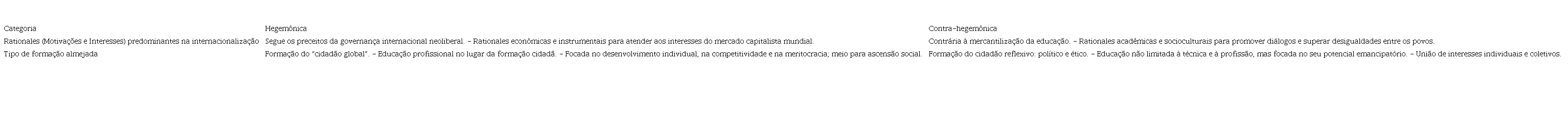 A naturalização dos aspectos positivos da internacionalização tem sido questionada, com a proposta de um olhar para o fenômeno a partir de lentes críticas. Nessa direção, Leal, Moraes e Oregioni (2018) propõem dezessete categorias para a análise crítico-reflexiva da hegemonia e da contra-hegemonia nesse cenário, partindo do pressuposto de que a internacionalização está alicerçada na matriz dominante de poder, e de que a educação é um campo influenciado por princípios econômicos. Dentre essas categorias, duas merecem destaque para o propósito deste trabalho, conforme apresentamos no quadro 1: