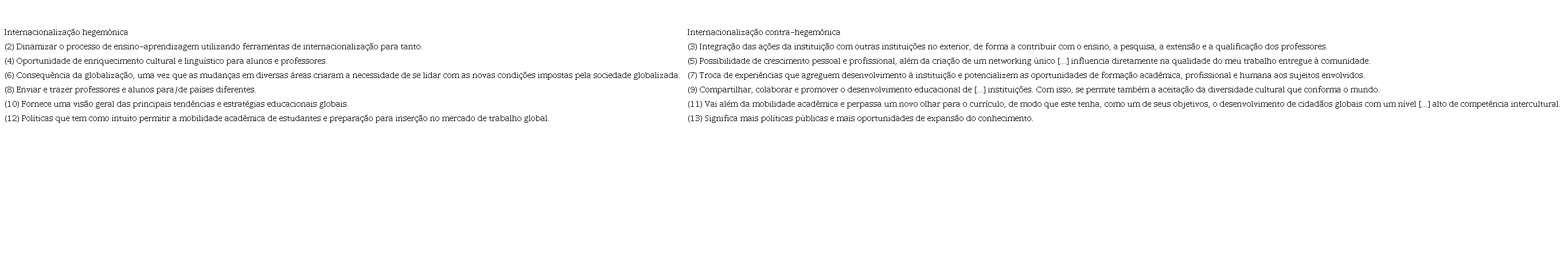No eixo da “internacionalização contra-hegemônica”, os professores também fizeram uso de algumas construções nominais como: “integração das ações da instituição com outras instituições no exterior” (3), “possibilidade de crescimento pessoal e profissional” e “qualidade do meu trabalho entregue à comunidade” (5), “troca de experiências que agreguem desenvolvimento à instituição” e “oportunidades de formação acadêmica, profissional e humana aos sujeitos” (7), “desenvolvimento educacional” e “aceitação da diversidade cultural que conforma o mundo” (9), “vai além da mobilidade acadêmica” e “desenvolvimento de cidadãos globais com um nível alto de competência intercultural” (11), “políticas públicas” e “oportunidades de expansão do conhecimento” (13), “ampliação das possibilidades de acesso a conhecimentos”, “desenvolvimento de consciência mais intercultural” e “oportunidades de vivências plurais” (15), “trocas significativas entre instituições, pessoas, estudantes, professores e acadêmicos [...] de países diferentes”, “troca de experiências” e “construção de saberes que, ao serem compartilhados e globalizados, se tornam humanizados” (17), “cooperação internacional entre instituições [...] com instituições estrangeiras”, “processos de ensino/aprendizagem”, “realização de pesquisas colaborativas” e “desenvolvimento pessoal e profissional” (19), e “desenvolvimento da sociedade” (21). As escolhas lexicais posicionadas no eixo contra-hegemônico indicam sentidos de uma internacionalização que visa a minimizar as diferenças de privilégios entre os grupos e estimular atividades colaborativas (VAVRUS; PEKOL, 2015), bem como se pauta por valores como parceria, troca e benefício mútuo (STEIN, 2019).