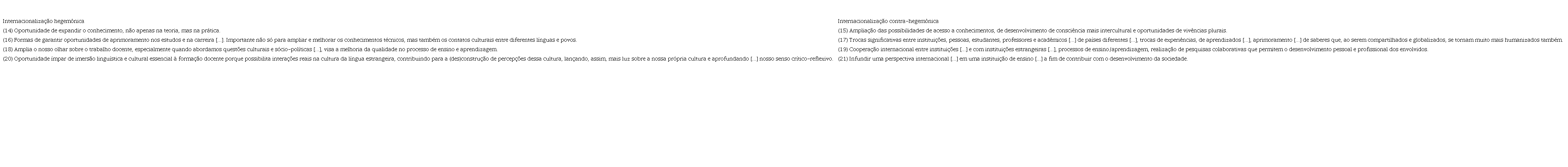 Ressaltamos que a dicotomia “[...] internacionalização hegemônica” versus “internacionalização contra-hegemônica [...]” não é bem definida, podendo seus descritores coexistirem de maneira híbrida e conflitiva (LEAL; MORAES; OREGIONI, 2018). Constata-se isso nos excertos: (4), (16), (18) e (20), os quais apresentam elementos frasais relacionados ora às concepções de enriquecimento, capacitação, melhoria de qualidade, ora às de troca linguística e cultural, abordagem cultural e sociopolítica e oportunidade de reflexão crítica. Desse modo, considera-se tarefa complexa delimitar os sentidos presentes nas representações discursivas construídas pelos professores participantes da pesquisa acerca da internacionalização.