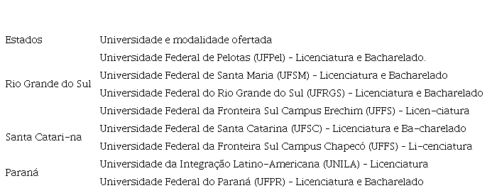Na Região Sul do Brasil, composta pelos estados do Paraná, Santa Ca-tarina e Rio Grande do Sul, há sete Universidades Federais que ofertam cursos de graduação em Filosofia. A matriz curricular de cada curso corresponde ao conteúdo formal a que o estudante que ingressa nele terá acesso em sua formação. Em razão de expressar os conteúdos básicos que fundamentam o curso, a matriz curricular, entendida como um excerto do currículo, é um pon-to de partida para a reflexão desenvolvida neste texto. No quadro abaixo são apresentadas as instituições pesquisadas neste estudo: