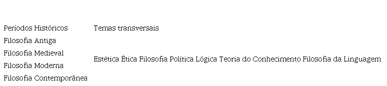 Do mesmo modo, após a divisão histórica da matriz curricular, apre-sentam um padrão de estudos que mescla temas como: Teoria do Conheci-mento, Lógica, Filosofia Política, Ética, Estética e Filosofia da Linguagem, que são desenvolvidos de forma transversal no trabalho pedagógico do Curso. Com base nesta divisão, se pode observar a seguinte estrutura que, em linhas gerais, se repete nos documentos analisados: