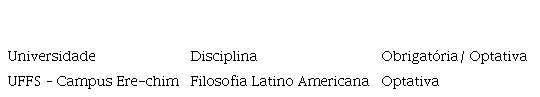 Para melhor destacar a pouca atenção ou possibilidade de o estu-dante de Filosofia conhecer temas centrais que afetam seu país, o quadro abaixo indica a alienação acadêmica a que este estudante está submetido. A “cisão” entre sujeito e objeto, tão comum a partir da Filosofia Moderna co-mo germe da ideologia capitalista, é recebida quase sem crítica, poucas ve-zes questionada a partir da realidade brasileira, conforme o que foi encon-trado nos documentos. É isso que se pode perceber a partir da organização das disciplinas que abordam o país nos documentos disponibilizados pelos cursos: