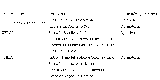 Os demais cursos apresentam, de forma residual, como disciplina op-tativa, “filosofia brasileira”, por exemplo. O tema de uma disciplina como esta, por mais vago que possa se apresentar, é um indício mínimo de atenção a questões filosóficas referentes ao país. Contudo, ela não aparece na maior parte dos cursos. Mais que essa ausência, é importante destacar a falta de componentes curriculares que abordem temas relativos à realidade brasileira – exemplo disso é não haver, com exceção da UNILA, cursos que abordem os 322 anos em que o país foi Colônia de Portugal, fato que denota a atenção da Filosofia voltada apenas aos “grandes filósofos clássicos” –. Assim, o estu-dante de Filosofia é formado em uma espécie de “não lugar”, formado em meio uma apresentação idealizada da história da filosofia, distante do que vive concretamente no Brasil, fazendo com que não consiga destinar aten-ção a temas centrais que determinam sua realidade, como é o caso do co-lonialismo no país.