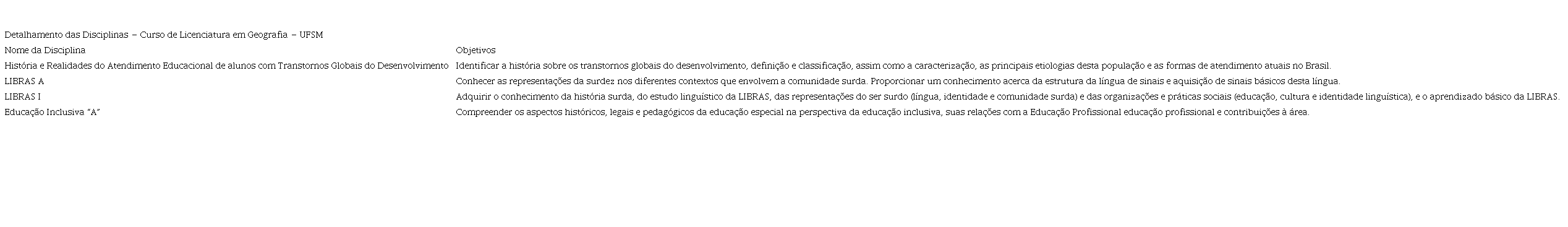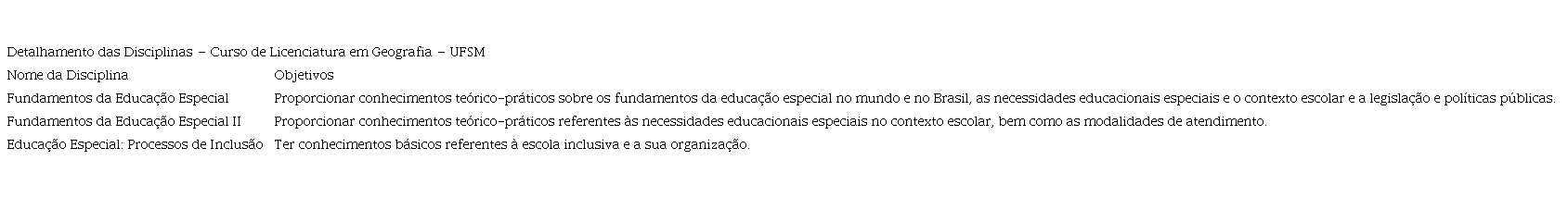 O curso de Geografia conta com uma carga horária total de 3.590 horas e oferta as disciplinas: Fundamentos da Educação Especial, com 60 horas; Fundamentos da Educação Especial II, com 75 horas; Educação Especial: Processos de Inclusão, com 30 horas; História e realidades do Atendimento Educacional de alunos com Transtornos Globais do Desenvolvimento, com 75 horas; LIBRAS A, com 30 horas; e LIBRAS, com 30 horas. Dessa forma, o curso tem uma oferta total de disciplinas vinculadas à educação inclusiva de 360 horas, 10,02% de sua carga horária total.