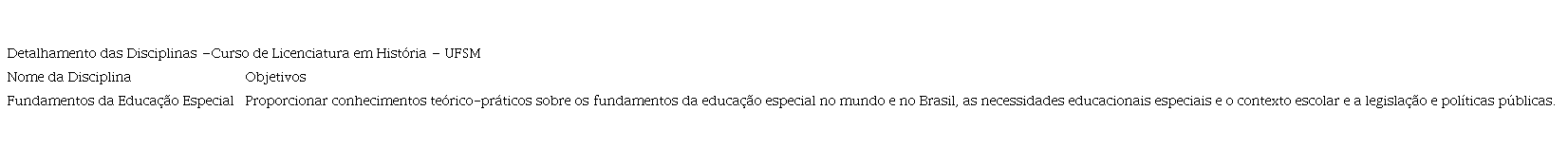 Os dados da investigação apontaram que o curso de História conta com uma carga horária total de 3.615 horas e oferta apenas a disciplina de Fundamentos da Educação Especial com carga horária de 60 horas. Dessa forma, o curso tem uma oferta total de disciplinas vinculadas à educação inclusiva de 60 horas, 1,65%de sua carga horária total.