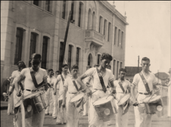 Tinham as festas juninas que eram feitas num galpão. O Gymnásio Mineiro, naquela ocasião, tinha dois galpões, eu não sei se hoje ainda tem. Tinha um de basquete que faziam as festas juninas que era uma quadra semi-coberta que tinham festas ali, bailes muito bonitos. E tinha um salão no primeiro andar que era um salão que faziam as festas de formatura, os bailes eram feitos ali. Isso eu guardo comigo com muita lembrança, com muito amor. A sociedade toda participava. O Sete de Setembro, por exemplo, era interessante, não só o Gymnásio Mineiro, mas todas as escolas de Uberlândia começavam uns quinze dias úteis antes do Sete de Setembro [...] a preparar, em todas as ruas durante o dia saiam marchando em volta do quarteirão, treinando para o Sete de Setembro. Era uma festa que todas as escolas de Uberlândia faziam, inclusive até o Colégio das Freiras usavam a banda do Colégio Mineiro, o Estadual, para tocar no Colégio das Freiras, porque as meninas não tocavam. E os alunos saiam uniformizados. Era um uniforme caqui. Tinha um uniforme caqui, uniforme amarelo, era todo mundo uniformizado (GARCIA, 2000, p. 3).