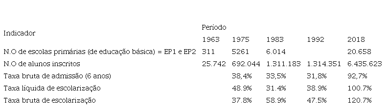 Com base nos dados da tabela acima, pode-se constatar que, em termos de número de escolas, registou-se um avanço numérico de 311 escolas, no período colonial, para 20.658, em 2018. O período de mudança foi demarcado pela independência nacional quando muitas escolas das então zonas libertadas passam a entrar nas estatísticas oficiais. O número de alunos matriculados no EP aumentou de 25.742, em 1963, subiu para mais de seis milhões em 2018. A taxa bruta de admissão, que espelha o número de alunos que entram com a idade adequada no EP (Ensino Básico), decresceu (de 38,4% em 1975 para 33,5% em 1983 e ainda 31,8% em 1992) quando comparado ao período da independência nacional, se encontrava muito abaixo dos 50% para 92,7%, em 2018. Ainda assim, sobre essa taxa, os dados da tabela 1 demonstram que há um trabalho que precisa ser feito para garantir que todas as crianças em idade escolar possam ter acesso à educação na idade recomendada.