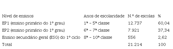 A tabela abaixo mostra os dados de 2018, sintetizando os níveis, anos de escolaridade, número de escolas e o percentual correspondente a cada um dos níveis. Com base nos dados, pode-se perceber que, em termos práticos, à medida que se avança do EP1 para o ESG do 1º ciclo, o número de escolas diminui, o que significa que as oportunidades de vagas diminuem e, consequentemente, a possibilidade de acesso a níveis subsequentes. Do total das escolas existentes em 2018, apenas 2,62% ofereciam o 1º ciclo do ESG, o que mais uma vez vem demonstrar a impossibilidade de todos os alunos acederem a esse ciclo.