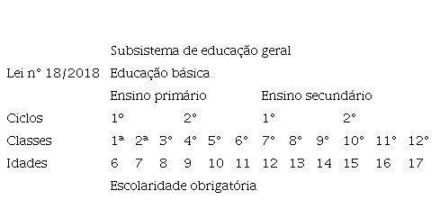 Atualmente, a EB compreende “o ensino primário e o primeiro ciclo do ensino secundário”. Contempla um total de nove anos de escolaridade (com três ciclos de três anos cada) o que inclui e equivale ao período da escolaridade obrigatória, de acordo com a Lei n.o 18, de 28 de dezembro de 2018 (MOÇAMBIQUE, 2018a; 2019b). Vale ressaltar que nem sempre os alunos em cada um dos ciclos se encaixam nas idades preconizadas por conta de reprovações e ingresso tardio na escola, com maior incidência nas zonas rurais.