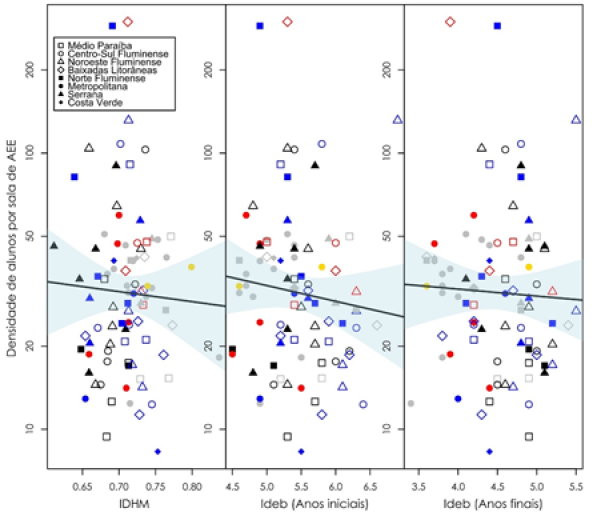 Alguns valores contrastantes merecem destaque na comparação intermunicipal. Nos municípios de São Pedro da Aldeia (IDHM: 0,712; IDEB AI: 5,3; IDEB AF: 3,9) e São Fidelis (IDHM: 0,691; IDEB AI: 4,9; IDEB AF: 4,5), por exemplo, há uma relação de quase 300 alunos por sala de AEE disponível. Por outro lado, nos municípios de Mangaratiba (IDHM: 0,753; IDEB AI: 5,5; IDEB AF: 4,4) e Rio Claro (IDHM: 0,683; IDEB AI: 5,3; IDEB AF: 4,9), esse valor de densidade é menor do que 10 alunos por sala de AEE, o que representa os maiores níveis de atenção aos alunos com NEE do Rio de Janeiro. Esses quatro valores se destacam no gráfico 1 como os pares de dados superiores (São Pedro da Aldeia e São Fidélis) e inferiores (Mangaratiba e Rio Claro).
