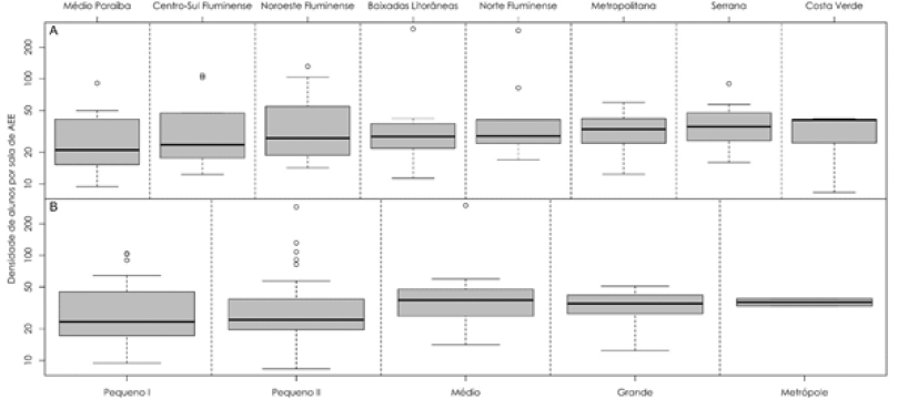 A atenção aos alunos com NEE (densidade de alunos por sala de AEE) nos agrupamentos Região de Governo e Porte SUAS indicou superlotação na maioria dos casos (≥ 25 alunos por sala de AEE). Considerando o valor arbitrado neste estudo como “recomendado” (12,5 alunos), nenhum dos agrupamentos apresentou esse grau de atenção aos alunos com NEE. Os dados municipais individualizados que constam no Censo Escolar 2019 revelaram que somente Armação dos Búzios, Itaguaí, Mangaratiba, Miguel Pereira, Quatis e Rio Claro estavam dentro do valor “recomendado”. A maior parte desses municípios (83%) é de pequeno porte (pequeno I e II). Por outro lado, cerca de 58% dos municípios do Rio de Janeiro estavam acima do valor representativo de “superlotação” da sala de AEE.