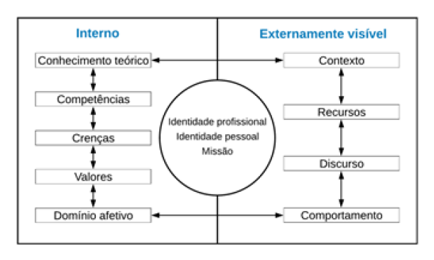 Korthagen (2010) propõe um modelo de cebola para os níveis de reflexão do docente com uma visão holística de aspectos profissionais e pessoais, incluindo contexto (físico-social), comportamento, competências, crenças, identidade e missão; desde o nível mais superficial ao mais profundo respectivamente.