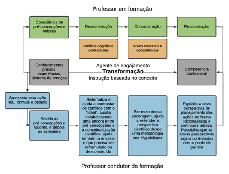 A Figura 2 ilustra o referido processo de transformação, destaca-se na parte superior (verde) a trajetória do professor em formação. Partindo dos conhecimentos prévios e sistema de crenças, passando pelas três etapas descritas anteriormente de Desconstrução, co-construção e reconstrução.