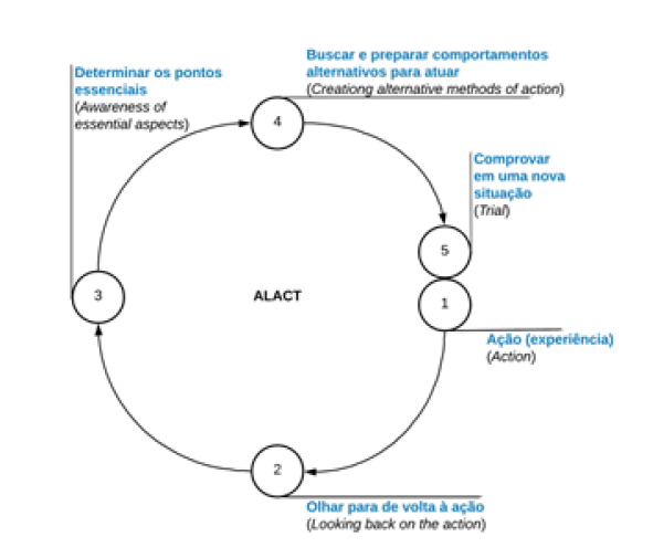 O modelo circular do ciclo reflexivo permite atravessar etapas de desconstrução, co-construção e reconstrução do conhecimento (ALSINA; BATLLORI; FALGÁS; GÜELL; VIDAL, 2016). O modelo ALACT se baseia na alternância entre “ação” e “reflexão” (ALSINA; BATLLORI; 2013). Como pode ser visto na Figura 3.