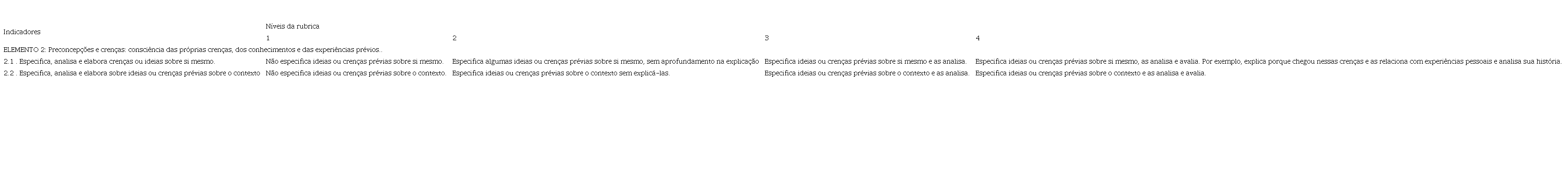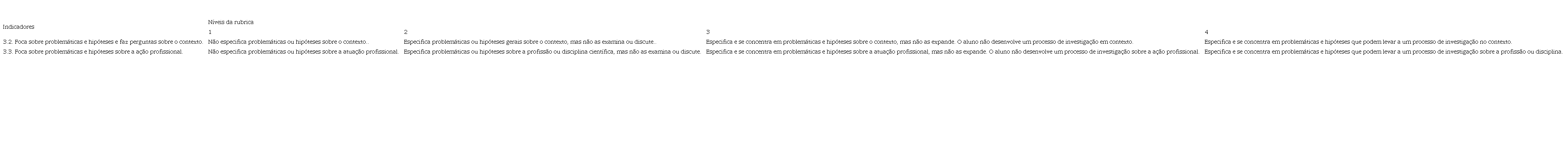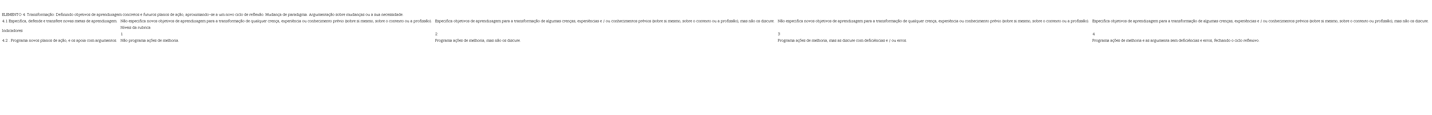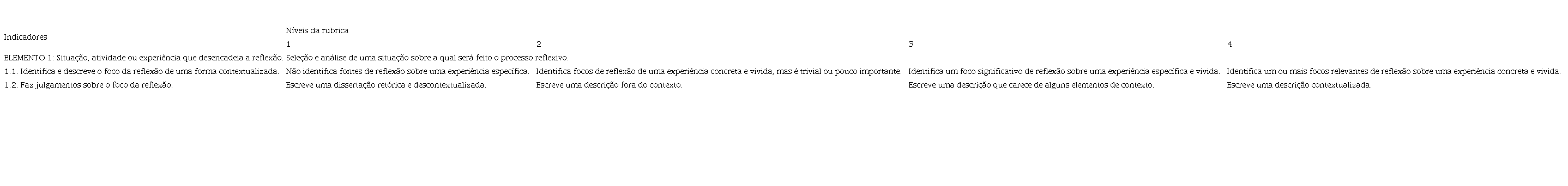 Alsina, Batllori, Falgás, Güell e Vidal (2016) estabeleceram quatro elementos da rubrica: a) Situação, atividade ou experiência que desencadeia a reflexão; b) preconcepções e crenças; c) investigação e foco; d) transformação. Estes elementos possuem indicadores que são avaliados em níveis de 1 a 4, segundo critérios específicos a cada elemento, como pode ser observado na Tabela 1. Fernández-Peña, Saurina, Serra, Fullana, Alsina, Colomer, Ayllón, Burriell e Pallisera 2016 propõem o instrumento validado para ser aplicado sobre narrativas reflexivas feitas por alunos na etapa de reconstrução da formação realista-reflexiva de modo a se verificar de modo estrutura as marcas de autorregulação e a completude do ciclo ALACT de Korthagen, Kesseils, Koster, Lagerwerf e Wubbels (2001).