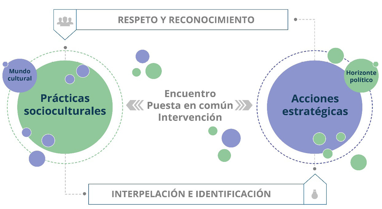 Se arriba así a una síntesis del proceso metodológico que implica el diálogo de saberes, entre el reconocimiento de universos culturales y el trazado de acciones estratégicas según horizontes políticos (ver Figura 2).
