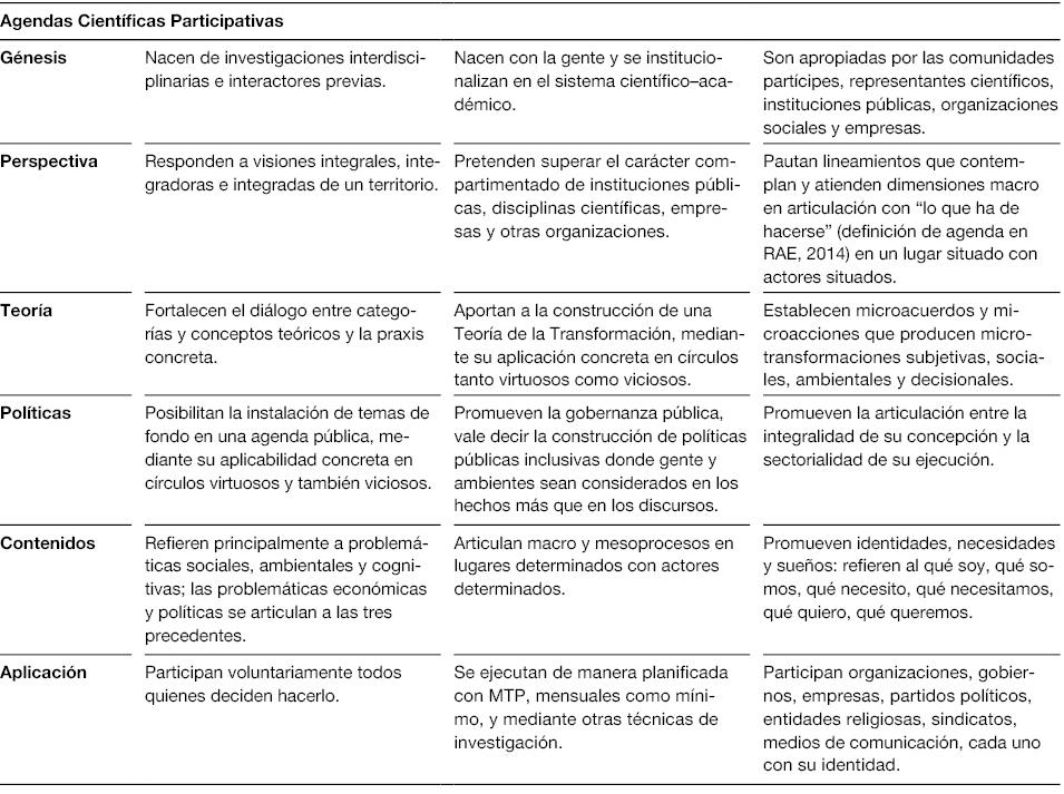 Cada iniciativa desde esta perspectiva teórica y con esta metodología aporta a la constitución de verdaderos sujetos partícipes de los procesos. En el reconocimiento y la revalorización de saberes y experiencias no validados institucionalmente es donde radica la mayor fuerza de los encuentros. También se funda allí el potencial transformador en espirales de reflexión y acción dialógicos. Agendas y Mesas no pretenden reemplazar a otros actores sino que, por el contrario, buscan interactuar con planes y programas de gobierno y con acciones e iniciativas de ciudadanos y organizaciones de base.