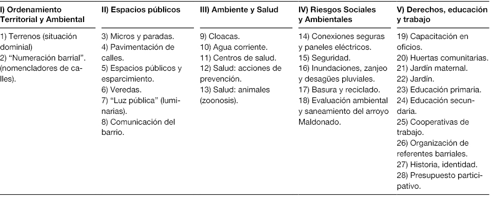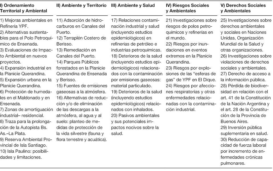 Ambas agendas se nutren de resultados del PIO “Gestión Integral del Territorio” desarrollado en La Plata, Berisso y Ensenada, y del trabajo sostenido en talleres participativos y MTP. Las Agendas son marcadamente diferentes entre sí, no solo por sus temáticas sino también por sus niveles de complejidad de aplicación. Fueron identificados 30 temas a incluir en la ACP “Territorio, industria y ambiente” y 28 en la ACP “Puente de Fierro Territorio Posible”, tal como se presenta en las Tablas 2 y 3.