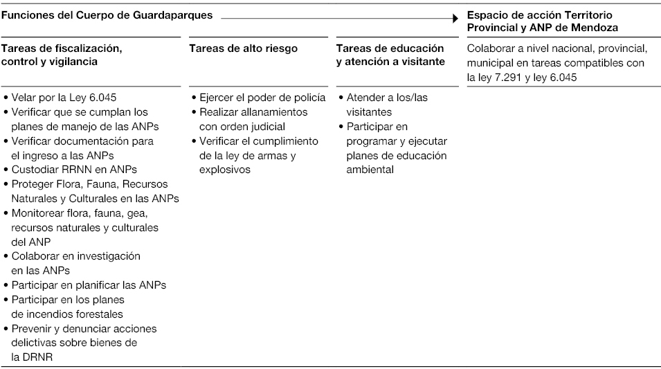 El cuerpo de guardaparques de la provincia de Mendoza fue creado en el año 2004 a partir de la sanción de la ley provincial 7291. En su artículo 4° establece como una de sus funciones “participar en la programación y ejecución de los planes de educación ambiental a implementarse en la provincia”. El artículo 105 diferencia tres grandes grupos de funciones: “tareas de fiscalización, control y vigilancia”, “tareas de educación y atención a visitantes” y “tareas de alto riesgo”. Esta clasificación ha sido respetada al momento de sistematizar las funciones ( Figura 3).