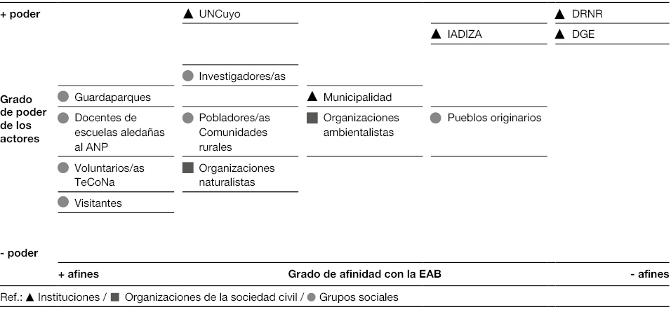 La provincia de Mendoza reúne una red de 19 ANPs provinciales, sin contar aquellas municipales que también existen, lo que representa alrededor del 13 % de la superficie del territorio provincial. En todas ellas no solo está el cuerpo de guardaparques, sino que otros actores se vinculan en su interior o en la zona buffer, más conocida como “zona de amortiguación”. Estos actores hacen uso del área para vivir y satisfacer derechos humanos fundamentales: de vivienda, alimento, trabajo, educación, recreación, espirituales, entre otros.