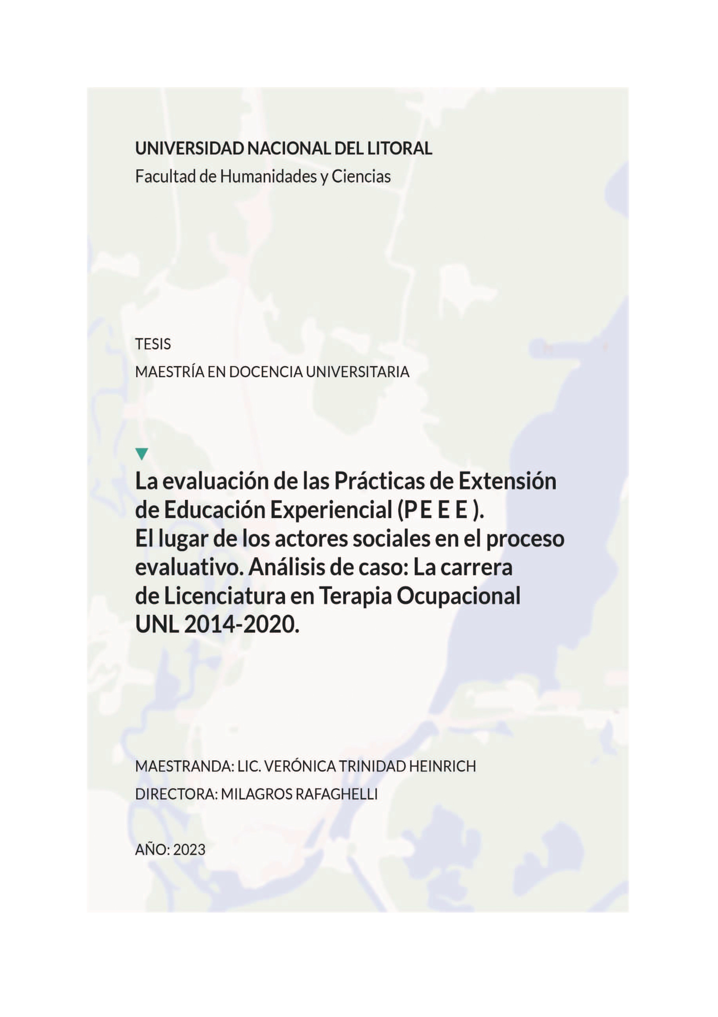 La tesis que nos ocupa en esta reseña tiene como nombre “La Evaluación de las Prácticas de Extensión de Educación Experiencias (PEEE). El lugar de los actores sociales en el proceso evaluativo. Análisis de Caso: la carrera de Licenciatura en Terapia Ocupacional UNL 2014–2020”. Su autora es licenciada en Terapia Ocupacional, docente, investigadora y extensionista en la Escuela Superior de Sanidad Dr. Ramón Carrillo, de Facultad de Bioquímica y Ciencias Biológicas, en la UNL.