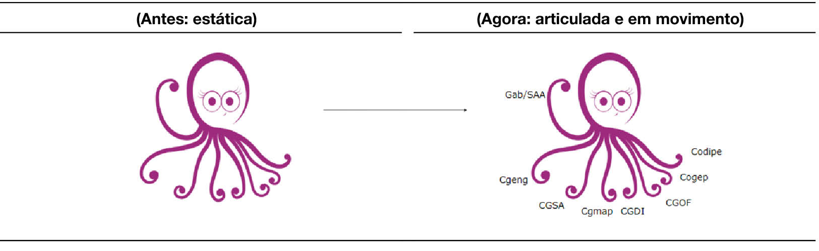 O mascote símbolo da EDI/SAA/SE/MS era um polvo, chamado Pilar. O nome escolhido foi para representar a atuação multidisciplinar da Subsecretaria, com uma capilaridade que atende a diferentes áreas, chegando até a ponta do Sistema Único de Saúde (SUS). Como o mascote já existia há algum tempo, com reconhecimento do público interno, foi incorporado como elemento dos aspectos estratégicos no Plano de Comunicação Interna. A fim de melhorar a imagem do mascote, a Equipe Comunicação do CAPAGIIC-Saúde fez animações e vídeos da Pilar, tentando humanizar seus movimentos. Cada um dos seus tentáculos também foi nomeado de acordo com os órgãos que atuam integradamente no contexto da SAA (Figura 1).