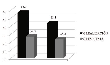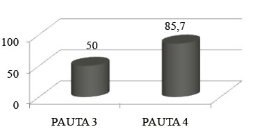 Porcentajes de respuesta a la vacunación en pacientes con más tiempo en hemodiálisis (%). Mayor porcentaje de respuesta con pauta 4 de forma significativa p<0.05.
