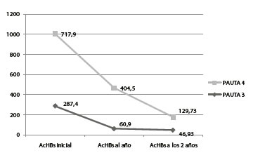 El 20% de los pacientes necesitó revacunación completa con la pauta de 4 dosis por no ser respondedores a ninguno de los esquemas de forma inicial. Además, al 6.66% hubo que administrar una dosis de recuerdo al año o a los 2 años por negativización de anticuerpos en el periodo de seguimiento. La tasa de AcHBs postvacunacional fue de media de 329.64±287.4 mlUI/ml con la pauta 3 y de 717.9±415.49 mlUI/ml con la pauta 4, siendo significativamente mayor la cuantificación con la pauta 4 (p<0.05). Las tasas mantenidas al año fueron también representativamente superiores con la pauta 4 (404.5±376.65 mlUI/ml versus 81.03±60.9 mlUI/ml con la pauta 3). Se apreció que a los 2 años de finalizada la vacunación, las tasas de anticuerpos no fueron significativamente diferentes entre ambos esquemas de administración. (Figura 2)