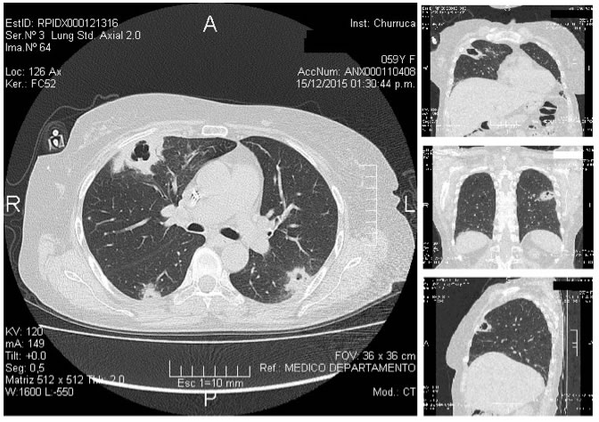 Se realiza omografía de tórax sin contraste intravenoso en la que se ven múltiples nódulos cavitados en ambos parénquimas pulmonares, sin derrame pleural ni pericárdico y sin adenomegalias.