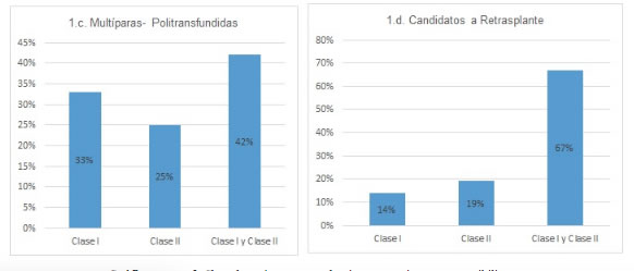 Poli y Multi N=12 (Clase I: 4, 14%; Clase II: 3, 25%; Clase I y II: 5, 47%). Retrasplante N=21 (Clase I: 3, 14%; Clase II: 4, 19%; Clase I y II: 14, 67%)