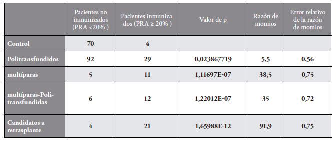 Todos los datos recolectados (sexo, transfusiones recibidas, embarazos, trasplantes previos) y los resultados obtenidos de los ELISA fueron introducidos en una planilla Excel (Microsoft Office, 2013) y luego analizados utilizando herramientas de estadística descriptiva. Para evaluar la asociación entre las variables y la sensibilización contra antígenos de HLA se utilizaron tablas de contingencia de dos por dos, test de chi cuadrado y razón de momios (odd radio). La razón de momios se calculó para cada factor de sensibilización aislado o combinado en http://www.samiuc.es/index.php/estadisticas-con-variables-binarias/medidas-de-comparacion/odds-ratio-or.html. Para todas las pruebas de hipótesis se fijó un nivel de significación de p < 0,05.