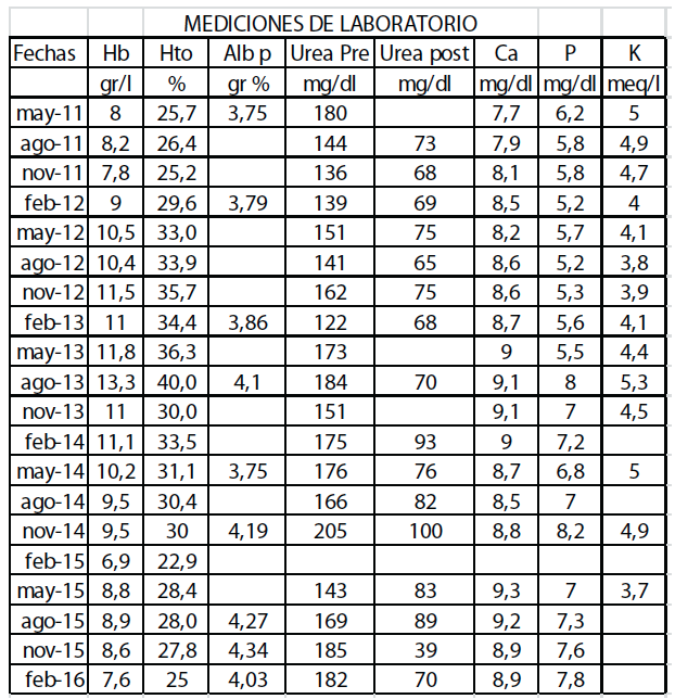 En la exploración física, la TA fue 160-100mmhg, F cardíaca 90´, sin edemas periféricos y con un cuadro de obesidad mórbida. En el análisis de laboratorio presentó: Hto 25,7%, Hb 8,2 g/L, álbumina 3,75 g/L, urea 180 mg%, creatinina 6.1 mg%, calcio 7.7 mg%, fosforo 6.2 mg%, potasio 5 mEq/l, glucemia en ayunas 93 mg. (Tabla 1)