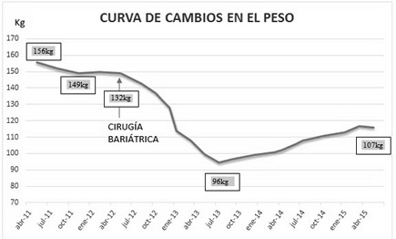En noviembre de 2012 alcanzó los 96 kg, 38 % respecto a su peso de ingreso a diálisis. El IMC de 54.7 disminuye a 40 kg/m2. (Grafico 1)