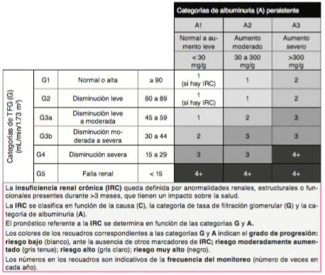 El grupo de trabajo Kidney Disease Improving Global Outcomes (KDIGO) define la insuficiencia renal crónica (IRC) como un conjunto de anormalidades renales-funcionales o estructurales caracterizadas por la disminución durante ≥3 meses en la tasa de filtración glomerular (TFG ≤60 mL/min/1,73 m2) o la evidencia en ese lapso de albuminuria (índice albúmina-creatinina [IA-C] >30 mg/g en al menos dos muestras consecutivas.(1, 2, 3)